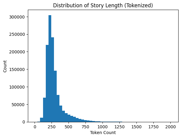 Now to inform the maximum sequence length used during training, we can look at the distribution of tokenized story lengths in the training set: